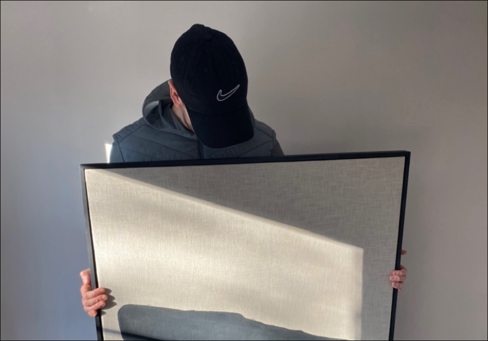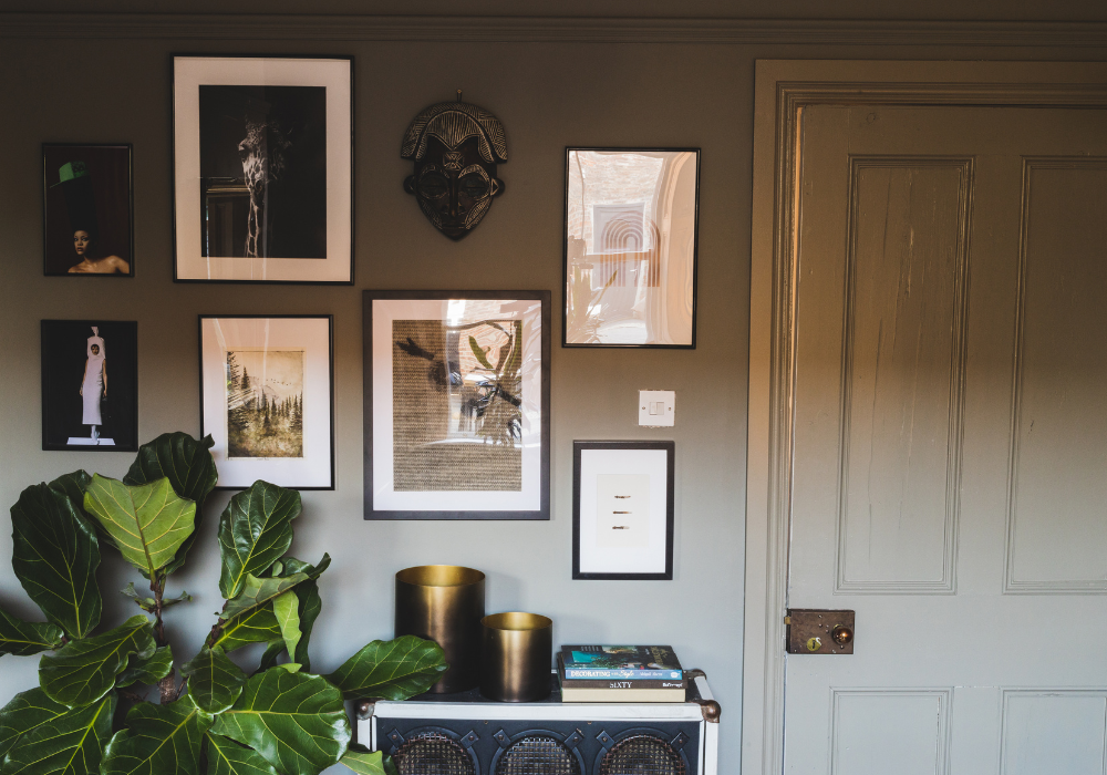 The grey-green Nomad paint was used to add depth to the corner space and to create the perfect backdrop for this gallery wall. Nomad paint is like a chameleon, it can adapt to any décor as it's not too bold, but not basic either. It's the Goldilocks of paint colours, always just right.